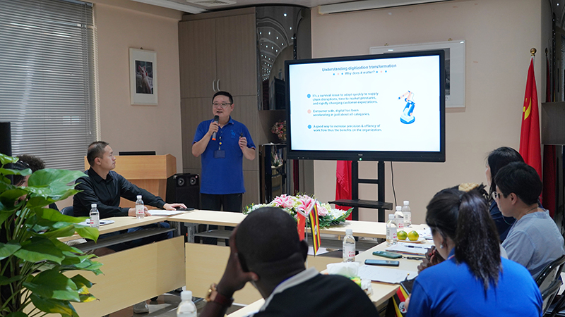 本次研修班由上海亚太地区经济和信息化人才培训中心副主任王科民带队,青岛英欧国际教育常务副主任王培淑和来自柬埔寨、乌干达、塔吉克斯坦、约旦、南苏丹、肯尼亚、南非 7 个国家的政府官员和技术专家共30余人组成,旨在围绕发展中国家产业数字化转型、智能制造、工业互联网企业、信息技术应用、数字技术应用等方面交流创新理念、分享最佳实践。