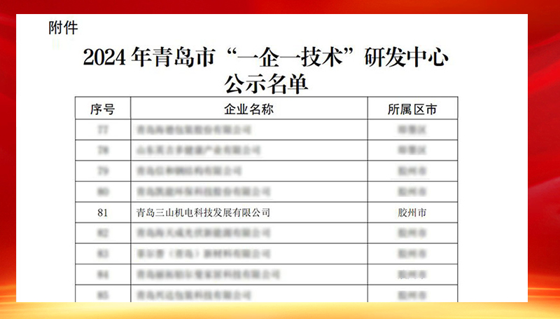 近日,经公司在线申报、区市初审推荐、市专家评审、社会公示等程序,青岛市民营经济发展局正式公布《2024年青岛市“一企一技术” 研发中心企业名单》,青岛三山机电科技发展有限公司凭借在技术开发、科研创新以及企业拥有自主知识产权的专利数量等方面成功入选,为公司进一步加强研发机构建设再添浓墨重彩的一笔。